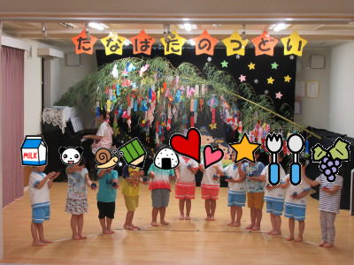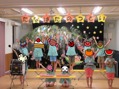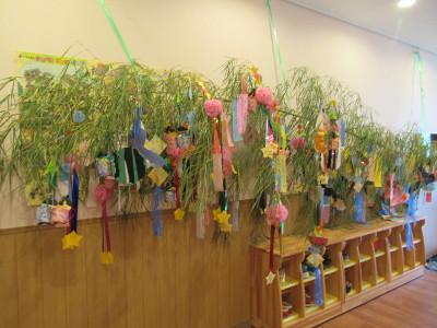 | ★2020年7月7日 【七夕の集い】 大きな笹に、子ども達の夢や願い事を書いた短冊と手作りの飾りを保護者と一緒につけて、エントランスと教室に飾りました。 ブラックシアターを見たり、他クラスの友だちの歌や楽器、手話を楽しみました。 ![]() |