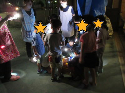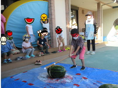 | ★2020年7月31日 【お泊り保育】 年長組のぞう組さんが楽しみにしているお泊り保育♪ みんなで野菜を収穫し、カレー作りをしました。 ![]() いよいよ、楽しみにしていたスイカ割り。 クルクル回して、真っ直ぐに歩けるかな? みんなの声に合わせて右へ・・左へ・・ よ~しそこだ!! ![]() 夜のイベント、きもだめし大会!! 暗い中、懐中電灯を手にお友達と手をつないで宝物探しを行いました。 みんなで協力し合い宝物を発見!! 最後にプレゼントをもらい、楽しい夜の一日になりました。 ![]() ![]() |