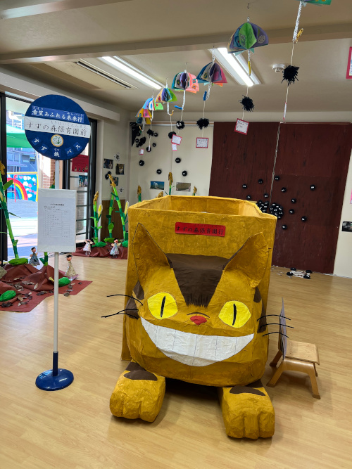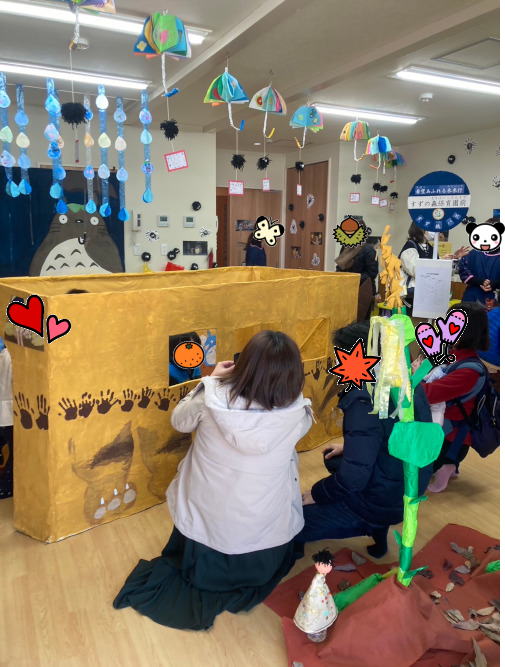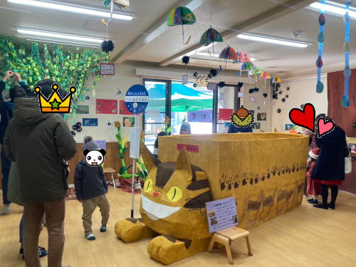| 2022年12月3日(土)【作品展】 ジブリパークができた事もあり、 今年のテーマは「となりのトトロ」でした。 公園で見つけた大きな枝やどんぐり、木の葉などを利用して トトロの世界観を表現しました。 ネコバスは、全園児の共同作品!! 大きなネコバスに乗って「ハイ!チーズ」 個人作品は、クラスごとに製作するモチーフを決めて作りました。 ![]() ![]() ![]() ![]() |
