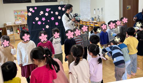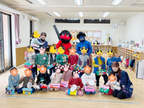 | 2023年3月22日 卒園進級式 卒園児へ在園児から手作りのランドセル型の小物入れが送られました。 ![]() 卒園児は、記念に壁画を描いてくれました。 ![]() ![]() |