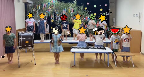 | ★2022年7月7日(木)【七夕の集い】 ♪♪ ささのはさ〜らさら〜 子ども達の歌声が園内に響く中、みんなが作った笹飾りが涼しそうに揺れていました。 年長さんは楽器の演奏をしてくれました。 先生から星座のお話を聞きました。 ![]() ![]() |
